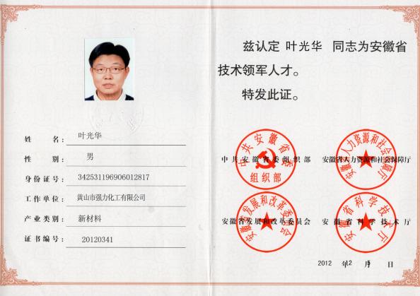 2012年公司總經(jīng)理葉光華同志被認定為安徽省技術(shù)領(lǐng)軍人才