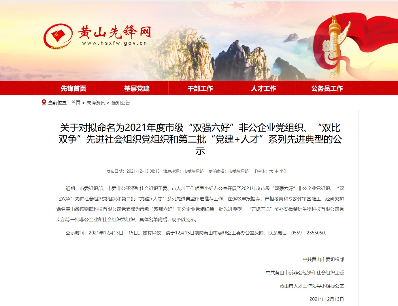 近期,黃山市市委組織部、市委非公經(jīng)濟和社會(huì )組織工委、市人才工作領(lǐng)導小組辦公室開(kāi)展了2021年度市級“雙強六好”非公企業(yè)黨組織、“雙比雙爭”先進(jìn)社會(huì )組織黨組織和第二批“黨建+人才”系列先進(jìn)典型評選推薦工作,在逐級申報推薦、嚴格考察和專(zhuān)家評審基礎上進(jìn)行評判。以“五亮工程”為載體,通過(guò)“亮”身份樹(shù)立黨員形象、“亮”責任促進(jìn)黨員工作、“亮”承諾凝聚共同愿景、“亮”業(yè)績(jì)體現黨員先進(jìn)、“亮”旗幟彰顯標桿引領(lǐng),充分促進(jìn)黨建與中心工作有機結合,將黨建質(zhì)量提升落到實(shí)處。我司董京星同志獲得黃山市市級“五亮”先鋒典型,強力化工全體同仁必將以之為楷模,不斷學(xué)習不斷提升,更好的投入工作服務(wù)社會(huì )!