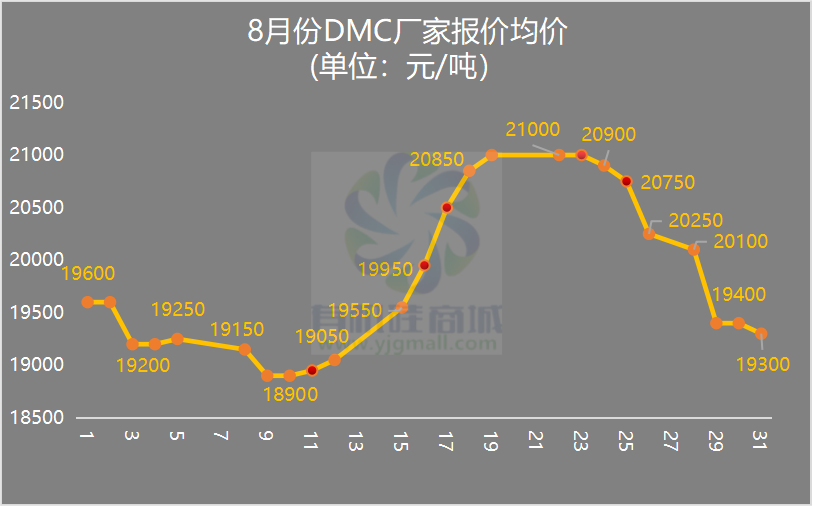 金九銀十的首發(fā)之日,有機硅仍處在上下游博弈階段,DMC在8月先跌后漲再走跌,價(jià)格走勢呈倒N字形。8月行情基本可以分三個(gè)階段:上旬,難敵需求施壓,龍頭單體廠(chǎng)DMC跌至18800元/噸,隨即封盤(pán)拉漲,刺激一波下游抄底備貨。中旬受原料金屬硅大漲提振,國內單體廠(chǎng)借勢延續拉漲,DMC在8月19日沖至21000元/噸;臨近月末,終端需求持續萎縮,市場(chǎng)避險情緒再起,同時(shí)金屬硅也重啟連跌模式,DMC又回到月初低點(diǎn),截止31日 ,山東單體廠(chǎng)DMC跌至18800元/噸。今日9月1日,持穩開(kāi)盤(pán)!