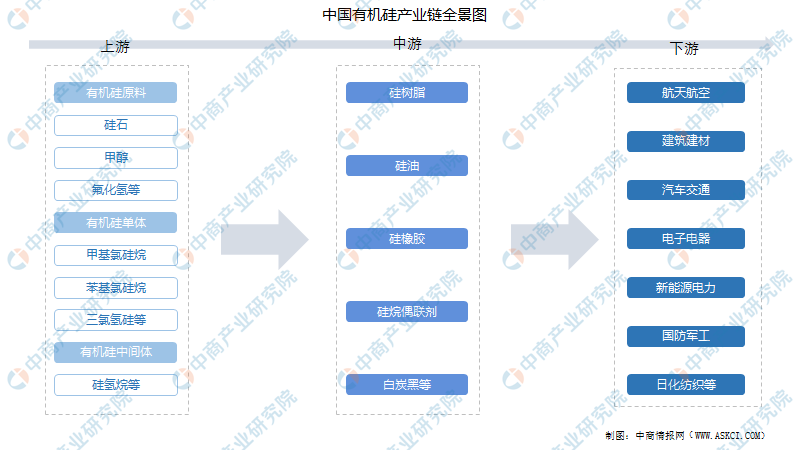 有機硅產(chǎn)業(yè)鏈上游為有機硅原料、有機硅單體及有機硅中間體;中游包括硅樹(shù)脂、硅油、硅橡膠、硅烷偶聯(lián)劑、白炭黑等;下游應用廣泛,主要把控航天航空、建筑建材、汽車(chē)交通、電子電器、新能源電力、國防軍工、日化紡織等。