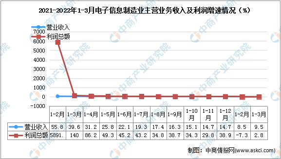 2022年一季度,規模以上電子信息制造業(yè)實(shí)現營(yíng)業(yè)收入33791億元,同比增長(cháng)9.5%,增速比1—2月份高1個(gè)百分點(diǎn),比同期工業(yè)營(yíng)業(yè)收入增速低3.2個(gè)百分點(diǎn);營(yíng)業(yè)成本29546億元,同比增長(cháng)10.2%;實(shí)現利潤總額1433億元,同比增長(cháng)2.8%,扭轉1—2月份負增長(cháng)態(tài)勢,營(yíng)業(yè)收入利潤率為4.2%。