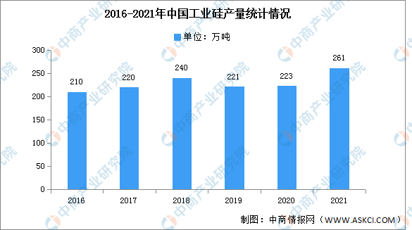 近年來(lái),我國為達碳中和、碳達峰的目標,可再生能源化轉型勢在必行,從而也帶動(dòng)了工業(yè)硅市場(chǎng)。2021年,我國工業(yè)硅行業(yè)總體運行平穩,行業(yè)供需兩旺,價(jià)格大幅上漲。2021年,中國工業(yè)硅產(chǎn)量261萬(wàn)噸,同比增長(cháng)24.3%。