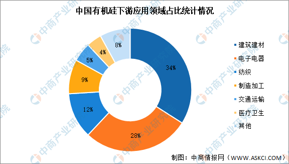數據顯示,我國有機硅行業(yè)下游應用領(lǐng)域中,建筑建材行業(yè)占比最大,達34%;其次為電子電器行業(yè)占比達28%,紡織、制造加工、交通運輸、醫療衛生行業(yè)占比分別為12%、9%、5%、4%。