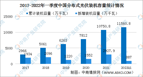 2021年分布式光伏裝機容量達到1.08億千瓦,突破1億千瓦,約占全部光伏發(fā)電并網(wǎng)裝機容量的三分之一。分布式光伏新增約2927.9萬(wàn)千瓦,約占全部新增光伏發(fā)電裝機的55%,歷史上首次突破50%。2022年一季度分布式光伏裝機容量1.16億千瓦,占光伏總裝機比重36.4%,與上季度相比提升1.2個(gè)百分點(diǎn)。新增裝機容量887萬(wàn)千瓦,同比增長(cháng)192%,新增分布式光伏占全國新增光伏裝機總量的67.1%,同比提升12.5個(gè)百分點(diǎn)。