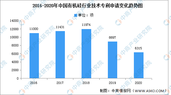 數據顯示,2016-2018年我國有機硅行業(yè)技術(shù)專(zhuān)利申請數量穩定增加,2019年開(kāi)始有所下降,2020年我國有機硅行業(yè)技術(shù)專(zhuān)利申請數量為6315項。