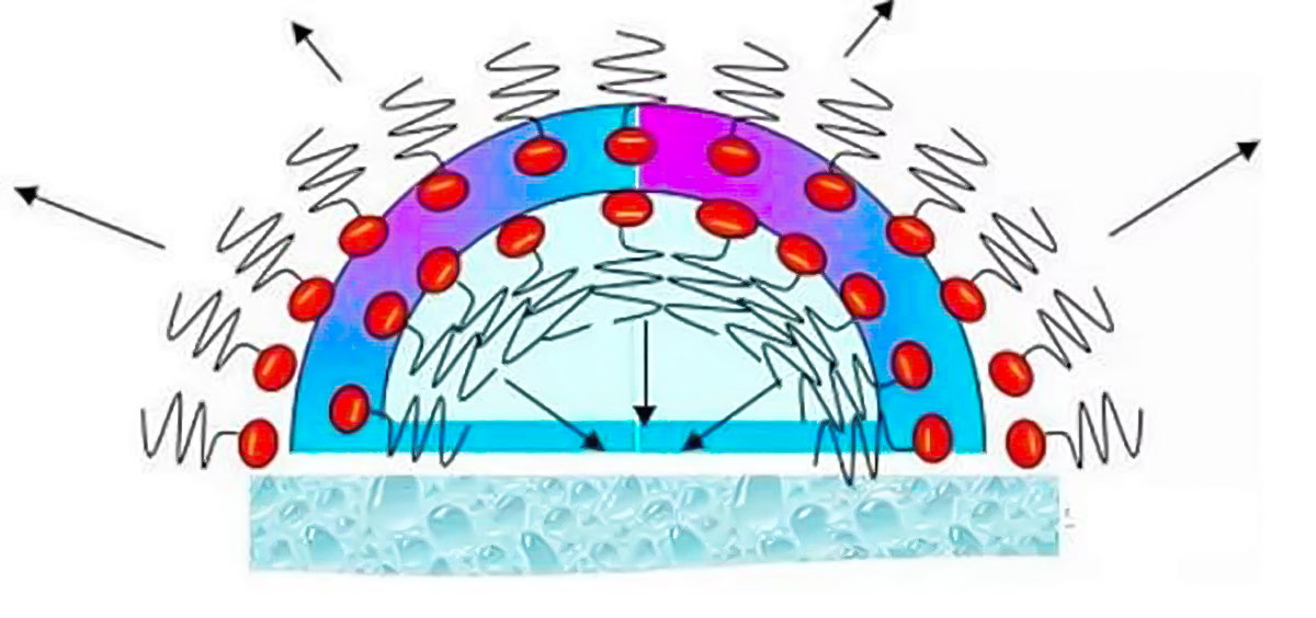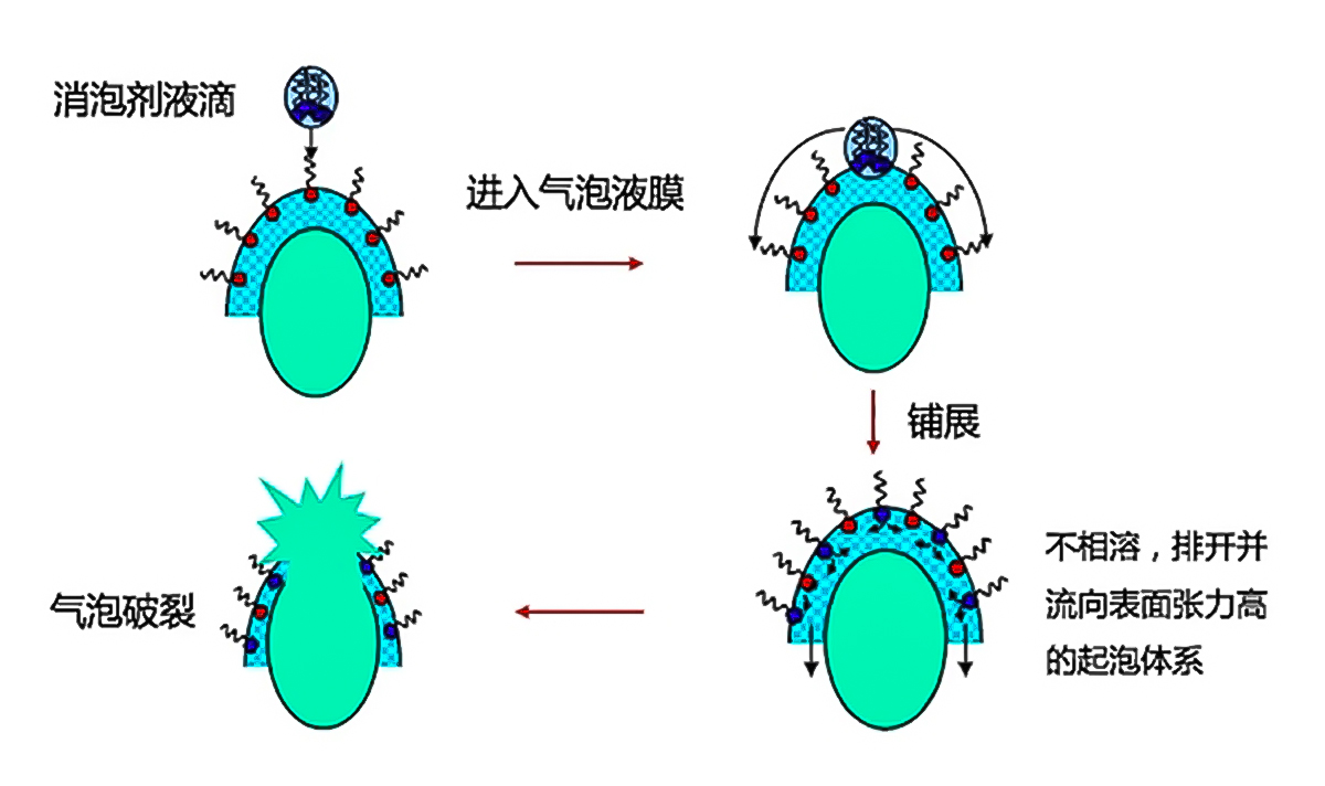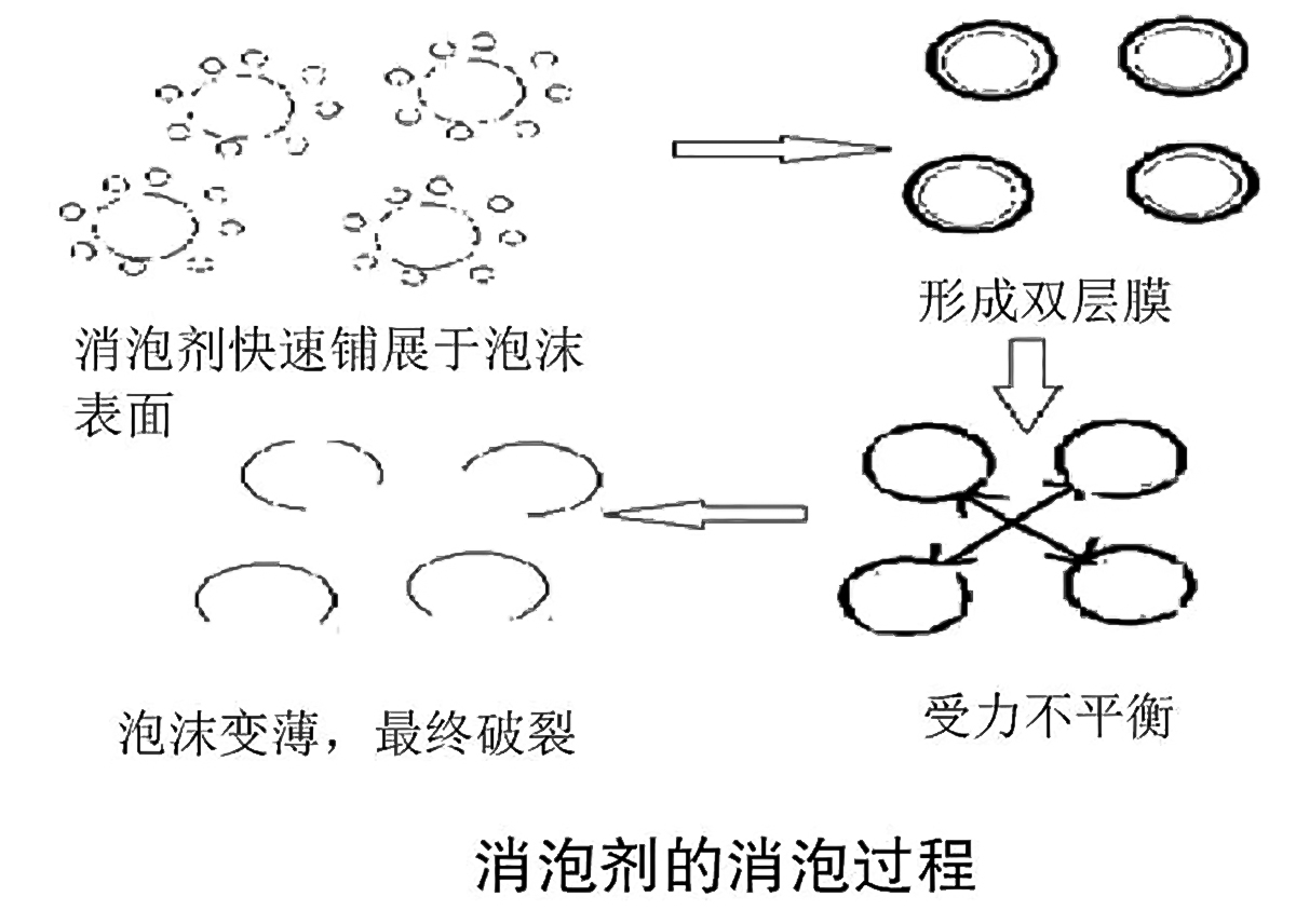 分散均勻的消泡劑滲透進(jìn)入泡沫薄層并且形成單分子膜,使其附著(zhù)力降低,易于薄層破裂。