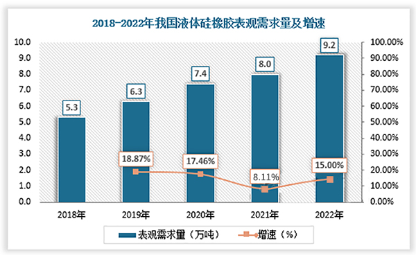 根據觀(guān)研報告網(wǎng)發(fā)布的《中國液體硅橡膠行業(yè)現狀深度分析與投資趨勢研究報告(2023-2030年)》顯示,液體硅橡膠由于耐熱耐候、無(wú)毒、電氣絕緣、生物相容性、無(wú)色透明、抗撕裂等諸多優(yōu)點(diǎn)而在醫用、電子電氣、食品母嬰等行業(yè)有廣泛應用。液態(tài)硅橡膠因其獨特的性能而成為非??量虘玫睦硐氩牧?,近年來(lái)需求量持續增長(cháng)。據數據,2021年我國液體硅橡膠表觀(guān)需求量為8萬(wàn)噸,較上年同比增長(cháng)8.11%;2022年我國液體硅橡膠表觀(guān)需求量為9.2萬(wàn)噸,較上年同比增長(cháng)15.00%。
