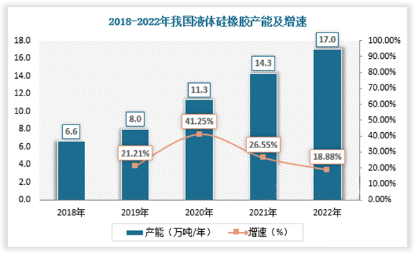 全球發(fā)達國家于20世紀70年代末期開(kāi)始研究液體硅橡膠技術(shù),到80年代末期開(kāi)始工業(yè)化生產(chǎn),與此同時(shí),我國液體硅橡膠研究工作起步,至90年代末、21世紀初我國液體硅橡膠進(jìn)入工業(yè)化生產(chǎn)階段。與發(fā)達國家相比,我國液體硅橡膠行業(yè)起步較晚,但發(fā)展迅速,現階段我國已經(jīng)成為全球液體硅橡膠生產(chǎn)大國。數據顯示,2022年我國液體硅橡膠產(chǎn)能達約17萬(wàn)噸/年,產(chǎn)量達約11.3萬(wàn)噸。