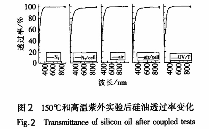 二甲基硅油是一種適合于液浸法冷卻聚光系統的冷卻介質(zhì)。通過(guò)高溫 85℃,150℃實(shí)驗紫外實(shí)驗以及溫度紫外耦合實(shí)驗考察了發(fā)現:硅油具有優(yōu)良的耐候性,實(shí)驗后透過(guò)率降低很小且集中在紫外區;性質(zhì)穩定極不容易發(fā)生化學(xué)反應;經(jīng)過(guò)硅油液浸的硅電池電性能沒(méi)有明顯衰降,只是電池表面析出了少量物質(zhì)。