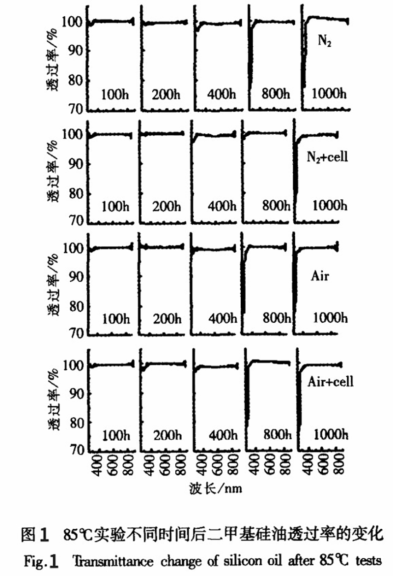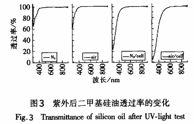 硅油中沒(méi)有活潑基團,所以化學(xué)性質(zhì)很穩定,沒(méi)有生色團(在紫外和可見(jiàn)光區產(chǎn)生吸收帶的基團為生色團,簡(jiǎn)單的生色團由雙鍵或叁鍵體系組成)和助色團(本身沒(méi)有生色功能,但當與生色團相連時(shí),就會(huì )發(fā)生n一π共軛作用,增強生色團的生色能力,使生色團吸收波長(cháng)向長(cháng)波方向移動(dòng)且吸收強度增加,如一0H、一0R、一NH,、一-NHR、一X 等),所以在紫外可見(jiàn)光區無(wú)吸收。實(shí)驗后硅油中也無(wú)生色團和助色團產(chǎn)生,因此實(shí)驗后硅油透過(guò)率降低的很少,且這部分降低很可能是電池表面物質(zhì)的微量溶解造成的,而不是硅油本身的問(wèn)題。