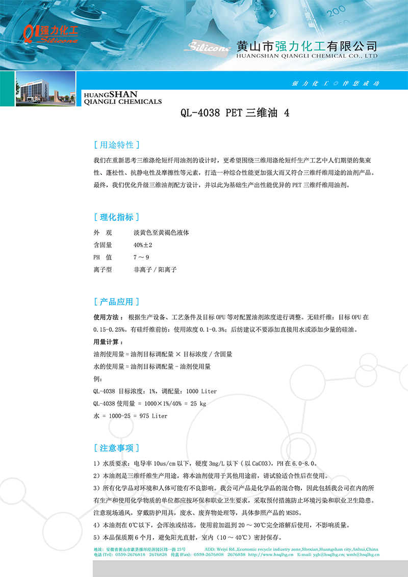 強力化工牌號QL-4038 PET三維油4 紡織處理劑