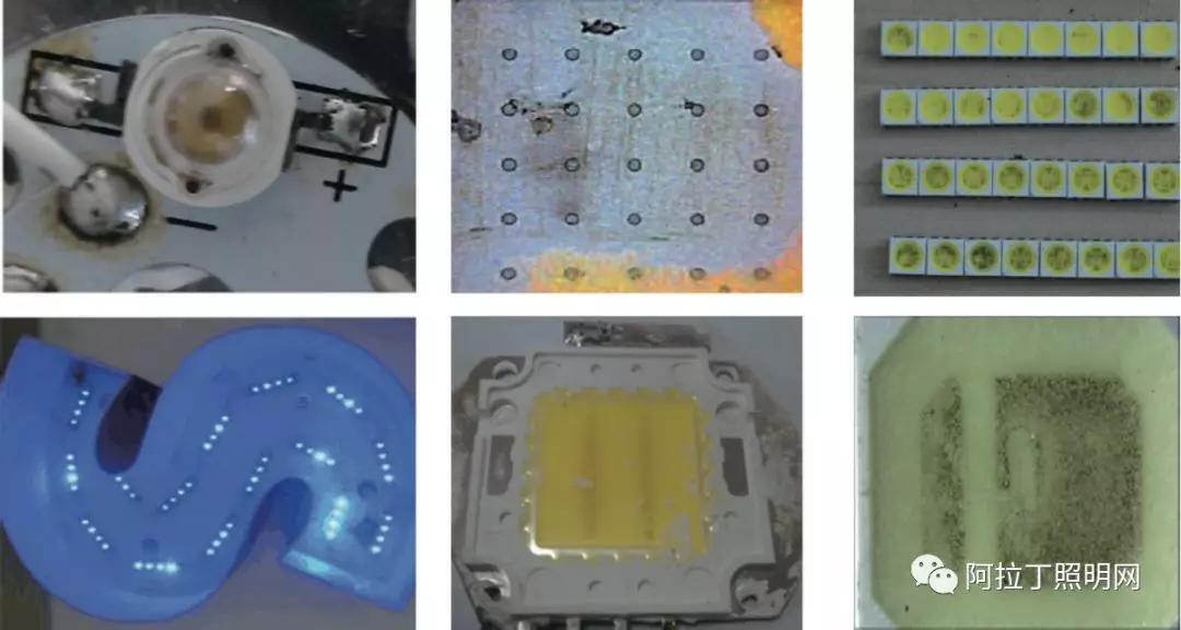 從圖一可以看到,不論燈珠形式,不論何種燈具,硫化發(fā)黑和鹵素發(fā)黑是LED終端經(jīng)常會(huì )遇到一個(gè)問(wèn)題,通常是LED支架反射銀層與環(huán)境中硫元素或者鹵素發(fā)生化學(xué)反應引起的外觀(guān)發(fā)黑,這種發(fā)黑通常不可逆,造成非常大的光衰。