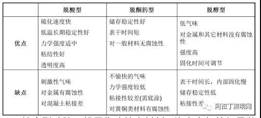 根據交聯(lián)反應生成的副產(chǎn)物種類(lèi),縮合型硅膠又可以細分為脫酸型、脫酮肟型、脫醇型、脫胺型、脫丙酮型、脫酰胺型等六種類(lèi)型,常見(jiàn)的三類(lèi)縮合型硅膠的優(yōu)缺點(diǎn)如下所示。
