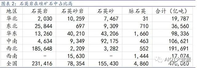 工業(yè)硅的上游原料是硅礦石,自然界的石英巖、石英砂、石英砂巖、脈石英等硅質(zhì)原料統稱(chēng) 為硅礦石,生產(chǎn)工業(yè)硅的原材料主要是石英巖。從中國硅礦石資源類(lèi)型看,石英巖查明資源儲量 23.1 億噸,占比 49%,主要分布在青海和陜西;石英砂儲量 15.5 億噸,占比 33%;石英砂巖儲 量 7.8 億噸,占比 17%;脈石英儲量 0.5 億噸,占比 1%。